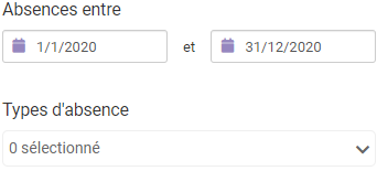 Le filtrage peut être effectué sur la base de la période (par défaut, l'année civile en cours est proposée) et sur la base du type d'absence. Vous trouverez ici tous les types d'absence créés (Comment créer un type d'absence?) et vous pouvez les cocher pour sélectionner un, plusieurs ou tous les types d'absence.