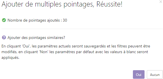 La confirmation indique combien de pointages ont été ajoutés. Plus encore, vous pouvez retourner à la fenêtre avec tous les critères que vous avez remplis pour générer rapidement une nouvelle série de pointages.