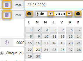 Dans les champs A partir de la date et Au, vous pouvez saisir une date de début et une date de fin. Par défaut, la date du jour est fixée, mais elle peut être modifiée en cliquant dans le champ de la date ou sur le bouton du calendrier situé à gauche du champ