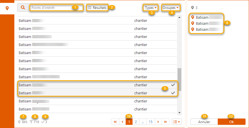 Cliquez sur le bouton Enregistrer en haut et activez ensuite la page Points d'intérêt à gauche. Bien entendu, ce groupe ne contient aucun point d'intérêt au moment de sa création. Cliquez sur le bouton Ajouter en haut pour faire votre sélection dans la liste des points d'intérêt.
