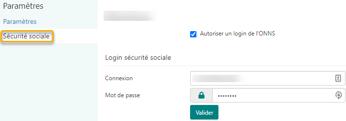 A gauche, vous trouverez la page Sécurité sociale avec l'option Autoriser un login de l'ONSS.