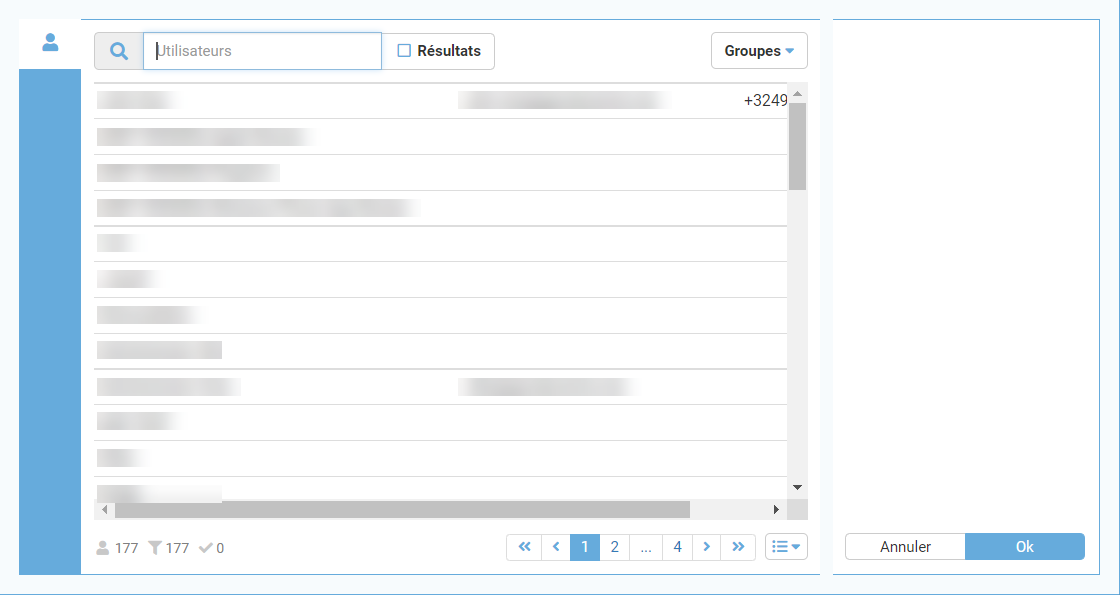 Cliquez sur le bouton Ajouter en haut de la page. Dans la fenêtre qui suit, sélectionnez le(s) utilisateur(s) souhaité(s). Procédez comme décrit dans l'article Comment sélectionner et filtrer les ressources? et terminez en cliquant sur le bouton Ok.