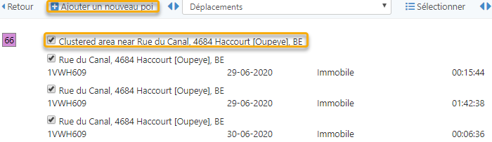 Sélectionnez le groupe de hotspots en cliquant dans la case à cocher à gauche du nom du groupe "Clustered area near ...". . Les différents hotspots appartenant à ce groupe sont ainsi tous sélectionnés. Cliquez ensuite sur le bouton Ajouter un nouveau poi, qui se trouve au-dessus de la liste hotspots.