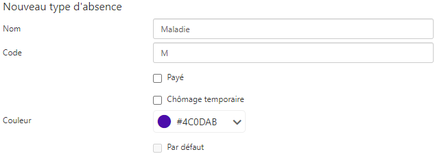 Cliquez sur Enregistrer en haut de la page. Le type d'absence a été créé et est prêt à être utilisé.