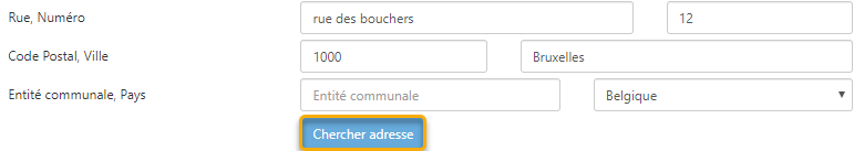 - Si vous choisissez Adresse, les champs Rue, Numéro d’habitation, Code postal, Ville, Entité communale et Pays apparaîtront. Remplissez ces champs et cliquez ensuite sur le bouton Chercher adresse. Une saisie partielle conduit généralement aussi au bon résultat (p.ex. en saisissant uniquement le code postal et non la commune, ou en omettant "rue", "avenue", ...).