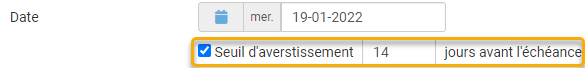 Souhaitez-vous être informé à l'avance de l'approche de cette date? Si oui, cochez l'option Seuil d'avertissement et notez combien de jours avant la date définie la notification doit être envoyée.
