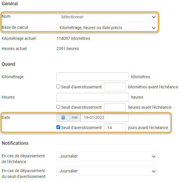 Dans le champ Base de calcul, sélectionnez Kilométrage, heures ou date précis.