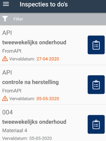 La date d'expiration est notée en orange et est précédée d'un signe d'avertissement dès que l'inspection à effectuer se situe dans la période du seuil d'avertissement (voir Comment ajouter un type d'inspection?). Cela vous donnera immédiatement une idée précise des inspections à effectuer.