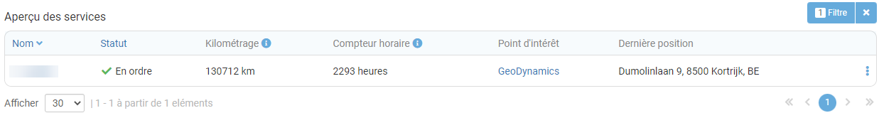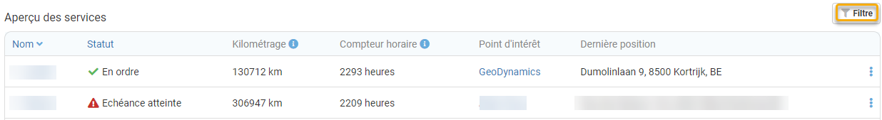 L'aperçu des services répertorie toutes les tâches d'entretien, quel que soit le point d'intérêt où se trouvent les véhicules. Toutefois, il est possible de la filtrer pour n'afficher que les tâches d'entretien pour les véhicules situés au point d'intérêt souhaité.