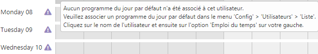 Il peut arriver que lors de la création d'un nouvel utilisateur de badge, vous oubliez de lier un programme du jour par défaut. Cela signifie que les pointages sont enregistrés au nom de cet utilisateur, mais ne peuvent pas être colorées comme étant mobilité, heures de travail, chargement/déchargement, ...