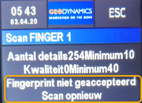 Si le doigt n'a pas été correctement scanné, cela sera signalé comme suit: "Empreinte digitale non acceptée. Scanner à nouveau". Faites une nouvelle tentative dès que la lumière verte recommence à clignoter.