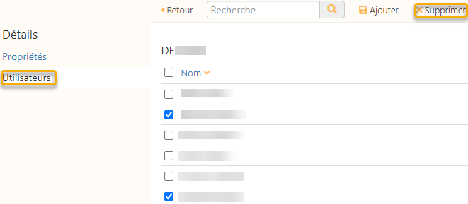 Sélectionnez le ou les utilisateurs en cliquant sur la case à cocher à gauche du nom, puis cliquez sur le bouton Supprimer en haut. Confirmez en cliquant sur le bouton Ok.