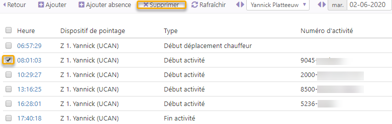 Cochez à gauche pour sélectionner le(s) pointage(s) souhaité(s).Cliquez sur le bouton Supprimer en haut et confirmez dans la fenêtre contextuelle qui suit en cliquant sur le bouton Ok.