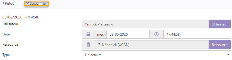 Ouvrez le détail du pointage en cliquant sur la date / heure. Cliquez sur le bouton Supprimer en haut et confirmez dans la fenêtre contextuelle qui suit en cliquant sur le bouton Ok.