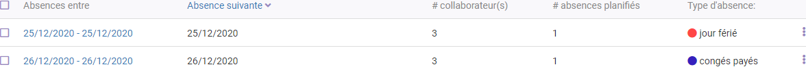 La fenêtre Absences de groupe contient la liste des absences de groupe prévues.