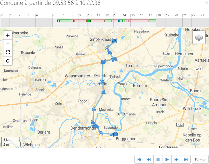 permet de visualiser le trajet, et l'infobulle affiche la vitesse, le nombre de satellites (pour évaluer la précision de la position) et l'adresse. S'il s'agit d'un arrêt, l'infobulle apparaîtra en cliquant sur ce bouton.