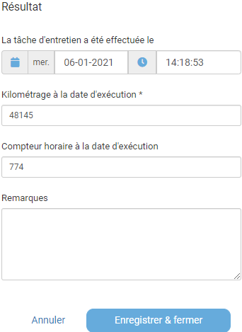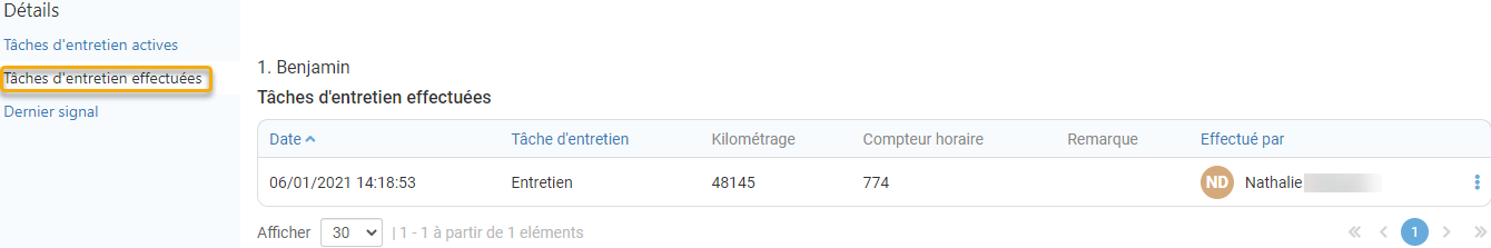 Outre la date et l'heure de l'entretien effectué et le nom de la tâche d'entretien vous trouverez également les paramètres qui ont été saisis : le kilométrage au moment de l'entretien, le nombre d'heures de fonctionnement au moment de l'entretien et les remarques éventuels. Vous trouverez également le nom de l'utilisateur qui a marqué la tâche de maintenance comme étant effectuée.