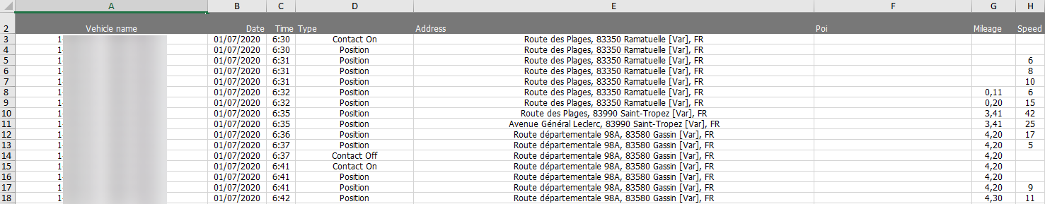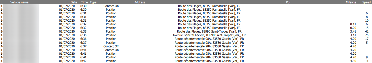 Si le rapport est généré via le relevé journalier, le rapport est extrait de la ressource sélectionnée à la date sélectionnée. Si vous souhaitez sélectionner plusieurs véhicules et/ou une période plus longue, le rapport doit être généré via le rapportage comme expliqué ci-dessous.