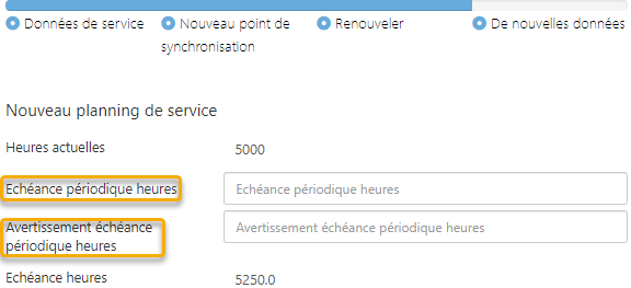 Concrètement, pour un service basé sur le kilométrage, les champs Echéance périodique heures et Avertissement échéance périodique heures doivent être remplis. Après la saisie, cliquez sur le bouton Suivant et terminez en cliquant sur le bouton Terminer.