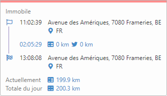 - Statut du véhicule: le statut de l'événement sélectionné est affiché en haut de l'écran (conduite, immobile, stationnaire, ...), mais le bord supérieur de la fenêtre de détails est également coloré selon le statut (conduite: vert, immobile: rose, stationnaire: bleu, ...).