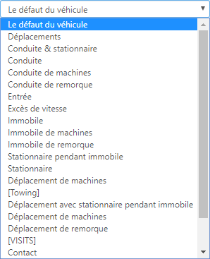 Par défaut, ce champ est défini sur le modèle Le défaut du véhicule, ce qui signifie autant que tous les statuts courant : conduite, arrêt, ralenti (et éventuellement remorquage, mode privé), chacun dans sa propre couleur (conduite: vert, arrêt: rose, ralenti: bleu) sont remplis.