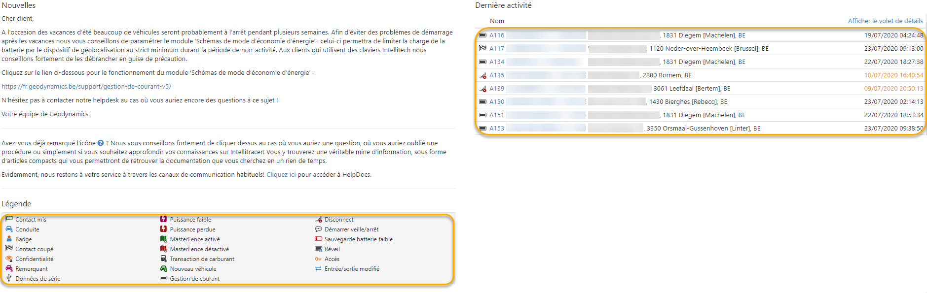 Vous trouverez à droite l'énumération des véhicules/pointeuses auxquels vous avez droit en tant qu'utilisateur, avec la position actuelle.