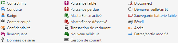 - L'icône avec l'état actuel : outre les états les plus évidents tels que la conduite et l'arrêt (contact coupé), il existe de nombreuses autres possibilités. La légende se trouve dans la partie gauche de la page d'accueil (en bas).