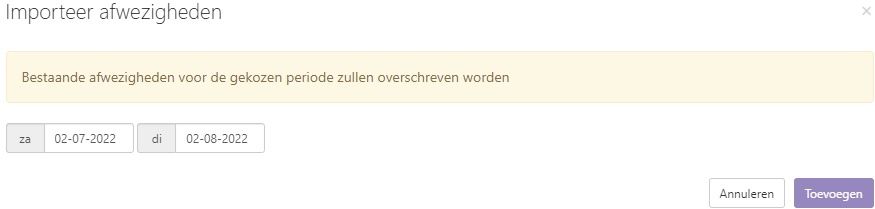 Klik bovenaan op de knop Toevoegen zodat het venster Importeer afwezigheden wordt geopend.
