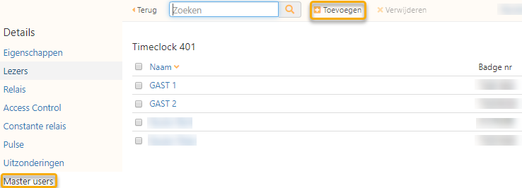 Klik de gewenste locatie aan om het venster met de details te openen en klik links op de bladzijde Master users. De reeds toegevoegde master users worden opgelijst, en ook het nummer van de gekoppelde badge wordt hier ter informatie vermeld.