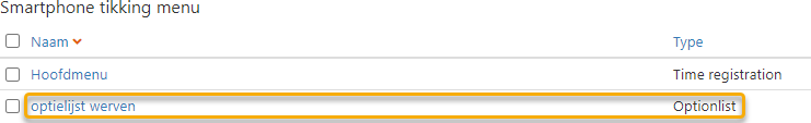 In de lijst van deelmenu's staat in de rechterkolom vermeld of het een optielijst, een multi-joblijst of het hoofdmenu (time registration) betreft.