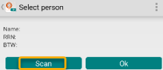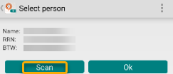 Bij het eerste gebruik van de app is de sectie Select person blanco, indien reeds een gebruiker geconfigureerd werd, worden diens naam, rijksregisternummer en BTW-nummer vermeld. Maak gebruik van de knop Scan om een (andere) persoon te koppelen.