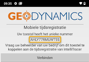 De installatie van de tijdregistratie app kan enkel worden voltooid indien er een profiel wordt aangemaakt in Intellitracer, gebaseerd op de unieke code die bij het openen van de app verschijnt.