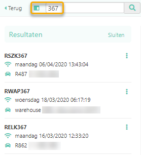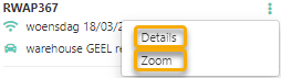 Naast de naam van de asset krijg je informatie ivm het ogenblik waarop de asset voor het laatst werd gecapteerd door het voertuig of de warehouse reader (weekdag datum tijdstip in hh:mm:ss) alsook de naam van het desbetreffende voertuig/warehouse reader. Klik op de 3 puntjes rechts van de naam van de asset voor een handig snelmenu om de detailfiche van de asset te openen of om in te zoomen op deze asset.
