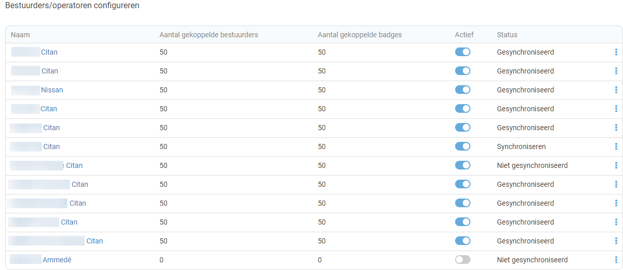 Naast de naam van het voertuig wordt het aantal gekoppelde badges vermeld. De status wordt eveneens weergegeven. Indien de status niet actief is, kan het voertuig worden gestart met eender welke badge die door de badgelezer kan worden gelezen. Het is dus van belang eerst de gebruikers te koppelen en daarna pas de status op actief in te stellen.