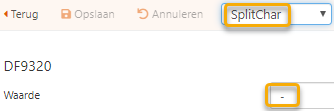 Kies in de keuzelijst bovenaan voor SplitChar. In het veld Waarde verschijnt het standaard scheidingsteken, namelijk - (liggend streepje). Vervang indien gewenst door een teken naar keuze, en bevestig via een klik op de knop Opslaan bovenaan.