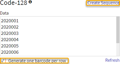 Wens je onmiddellijk meerdere codes te genereren? Noteer deze onder elkaar in het veld Data en vink vervolgens de optie Generate one barcode per row aan alvorens op de knop Create sequence te klikken. Zoniet worden alle ingegeven codes samengevoegd tot 1 lange barcode!