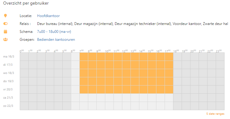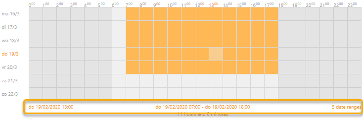 Ieder schema van toepassing wordt bovendien heel visueel voorgesteld in het uurrooster. Als je met de muisaanwijzer boven een tijdvak (oranje ingekleurd) binnen het uurrooster zweeft, krijg je onder het rooster informatie ivm weekdag, datum en tijdstip en de gedefinieerde range in het schema alsook de duur van de range.