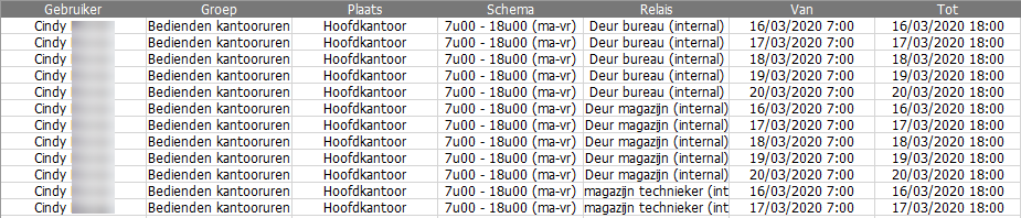 De informatie wordt verspreid over de kolommen Gebruiker, Groep, Plaats, Schema, Relais, Van en Tot.