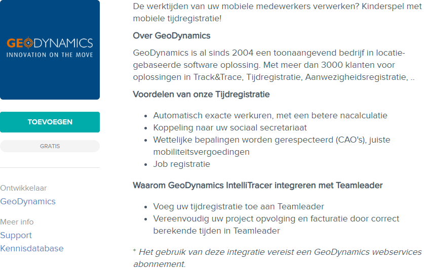 Ga naar de integratie op de Teamleader marketplace en klik op de knop Toevoegen. https://marketplace.teamleader.eu/nl/nl/detail/geo-dynamics/geo-dynamics-intelli-tracer/9d6e21.