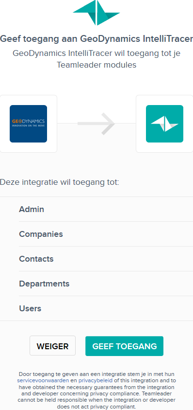 In de volgende stap moet de toestemming worden verleend om de gegevens in Intellitracer op te halen. Klik onderaan op de knop Geef toegang om de toegang te verlenen en aldus de koppeling te activeren.