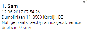 Op de kaart worden de resources weergegeven als het icoon van de huidige status. Door op het icoon te klikken, verschijnt de tooltip met daarin de naam van het voertuig, datum/tijdstip van de laatste registratie, adresgegevens, nuttige plaatse en snelheid. Deze tooltip kan je sluiten door op het kruisje in de rechter bovenhoek te klikken.