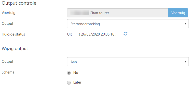 Standaard staat het veld Schema ingesteld op Nu, Dit betekent dat het commando voor de activatie van de startonderbreking na bevestiging onmiddellijk zal worden verzonden. Dit commando zal een relais aansturen en er op die manier voor zorgen dat het voertuig niet meer kan gestart worden.