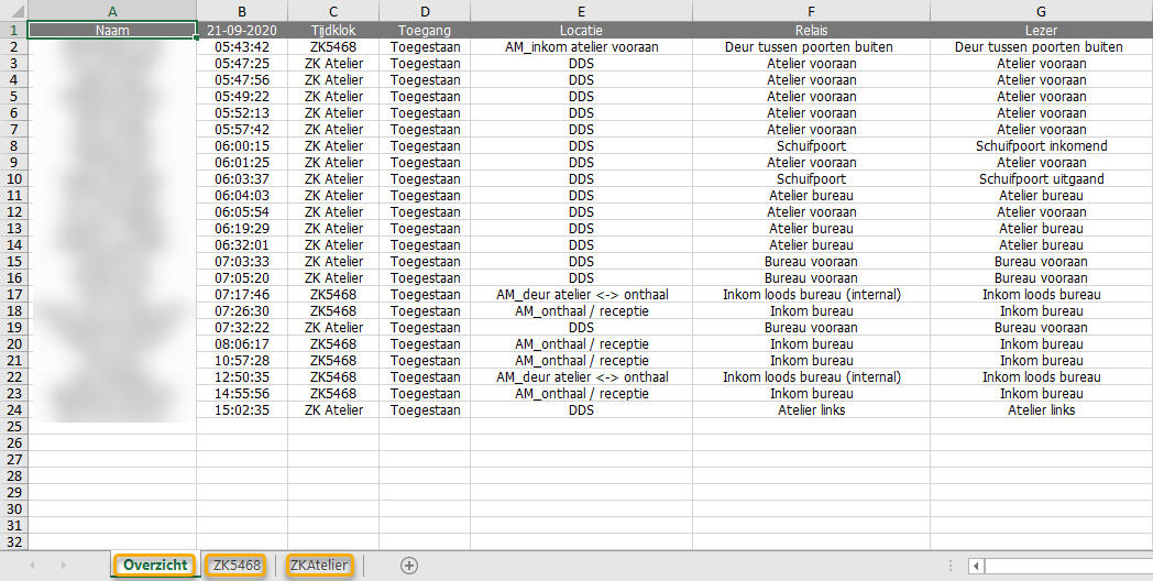 Het werkblad Overzicht bevat de toegangstikkingen op alle prikklokken, maar deze worden op de volgende werkbladen opgesplitst per prikklok.