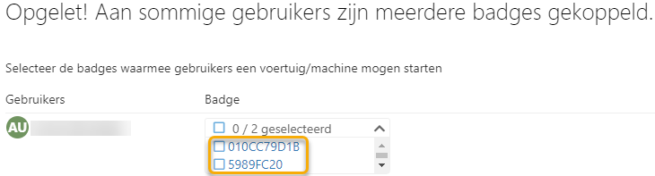 Indien meerdere badges zijn gekoppeld aan de gebruiker, moet in het venster dat volgt verduidelijkt worden met welke badge(s) het voertuig/de machine kan worden gestart. Dit gebeurt door de badge(s) aan te vinken. Klik vervolgens op de knop Opslaan om dit venster te sluiten.