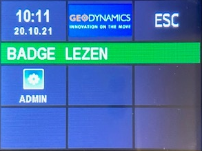 Bij het opstarten van de prikklok vind je op het startscherm, onder de vermelding "badge lezen", de knop Admin. Druk op deze knop om verder te gaan.