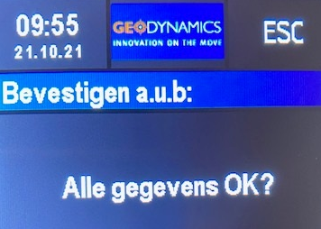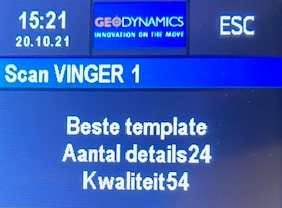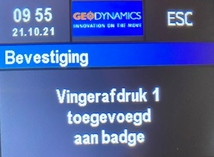 Raak opnieuw het scherm aan zodat het scherm met melding "Bevestiging. Vingerafdruk toegevoegd aan badge" verschijnt. Deze wordt onmiddellijk gevolgd door de melding "Bevestigen aub. Alle gegevens ok?". Raak het scherm nogmaals aan en volg dezelfde procedure voor de tweede vingerafdruk.