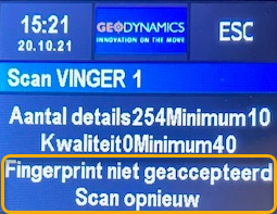 Indien de vinger niet correct werd gescand, wordt dit als volgt gemeld: "Fingerprint niet geaccepteerd. Scan opnieuw." Onderneem een nieuwe poging zodra het groene licht weer begint te knipperen.
