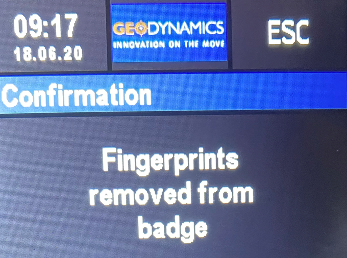 Houd de badge voor de lezer tot je de melding krijgt dat de vingerafdrukken zijn verwijderd: "Fingerprints removed from badge".