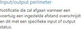 Zijn je voertuigen uitgerust met inputs of outputs? Dan heb je wat betreft notificaties een pak mogelijkheden! Het Inputalarm zal je op de hoogte brengen als de input hoog dan wel laag komt te staan tijdens de ingestelde periodes. Het Input niet gewijzigd-alarm geeft je net een seintje indien dit niet gebeurt. Daar voegen we nu een derde alarm aan toe: een inputalarm waarbij de afgelegde afstand als extra parameter wordt ingesteld.