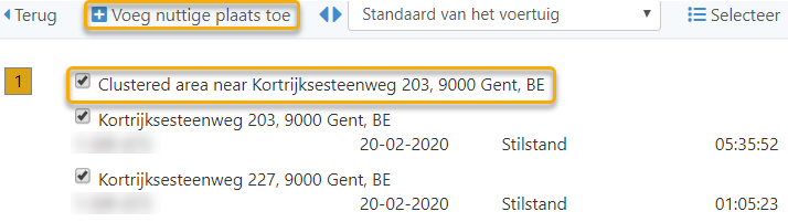 Selecteer de cluster van hotspots via een klik in het selectievak links van de clusternaam "Clustered area near ..." . De verschillende hotspots behorend tot deze cluster worden hiermee alle geselecteerd. Klik vervolgens op de knop Voeg nuttige plaats toe, deze is te vinden boven de lijst van hotspots.
